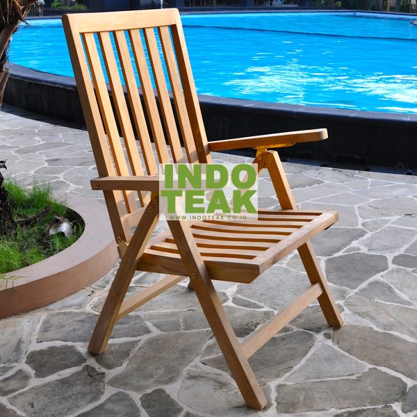 Indoteak.co.id offer the best solid wood Premium Teak Outdoor Folding Reclining Arm Chair Furniture – Dorset Five Position Chair Luxury Design Premium garden chairs furniture made from solid teak wood with SVLK Certificate as legal wood in Indonesia. Our Dining outdoor reclining chair is ideal for use with any of our folding square, extending table, oval extending table, rectangular, round and oval folding teak tables to make a complete folding outdoor set. The teak patio garden folding chair collection are delivered to you full assembled, simple design, premium wooden teak material and ensures quality, stability and durability.